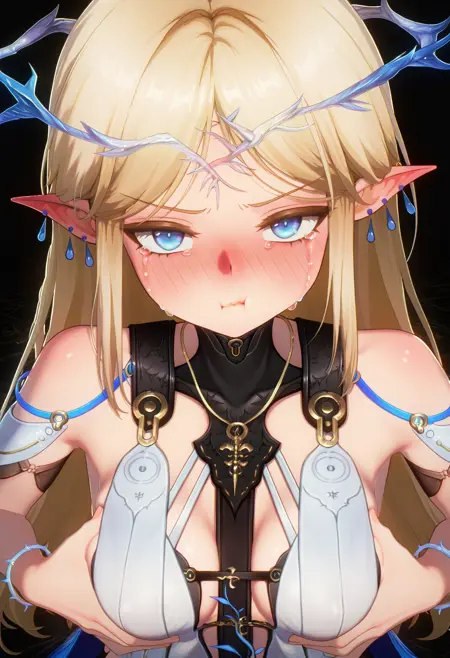 Cartethyia, blonde hair, long hair, horns, blue eyes, earrings, forehead mark, bracelet,Lower body