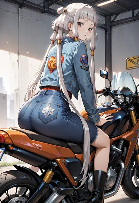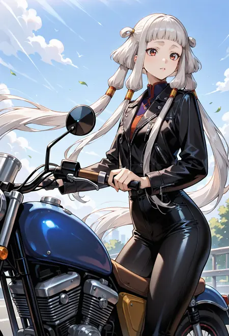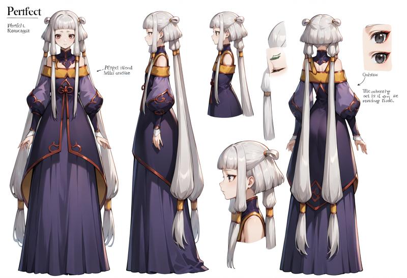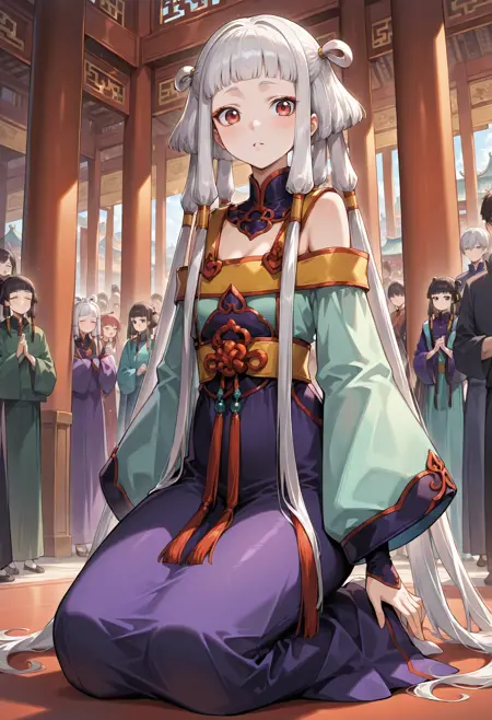 Appearance: 1girl, red eyes, long hair, white hair, hair rings, hair tubes, sidelocks, grey hair, bangs, blunt bangs, quad tails, black eyes, very long hair