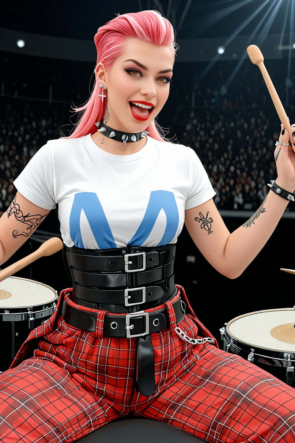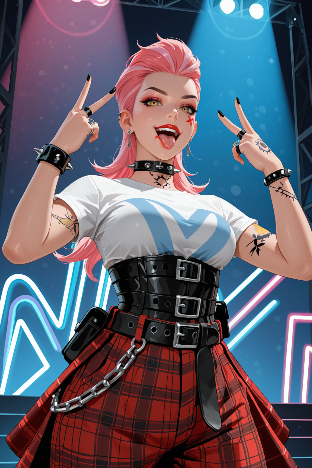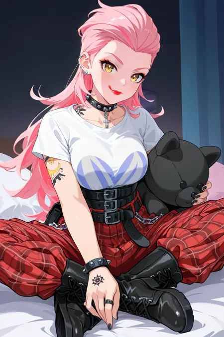 Trigger : Jeanne, black nails, pink hair, multicolored hair, hair slicked back, long hair, x facial mark, across eye, yellow eyes, black eyeliner, eyeshadow, earrings, ear piercing, red lipstick, smeared lipstick, spiked collar, neck tattoo, arm Tattoo, print shirt, corset, spiked bracelet, multiple rings, Hand Tattoo, multiple belts, belt Pouch, wallet chain, Plaid pants, Plaid waist cape, cross-laced footwear
