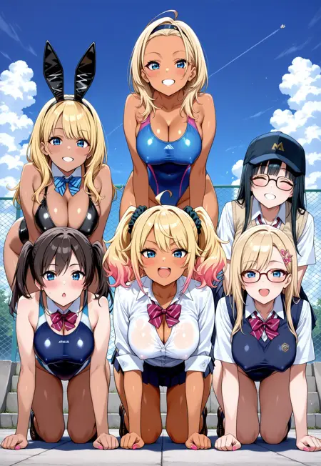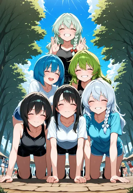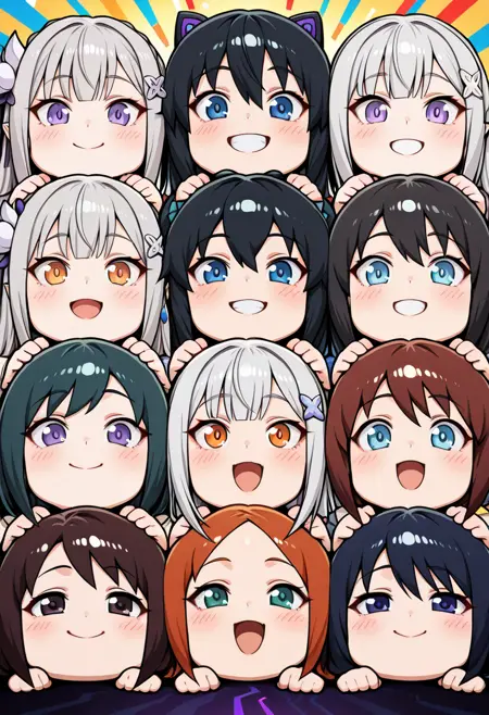 Lora was intended to draw people lined up in a pyramid formation for 6 people. The main dataset turns off exactly such drawings. But it does not consistently display more than three different characters. Large pyramids for 10+ people are especially bad. But these are already limitations of illustrious and sdxl models. They cannot display a large number of characters at the same time in detail.