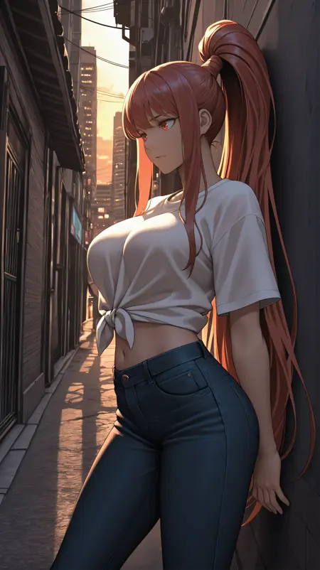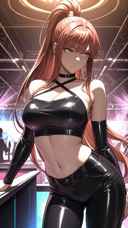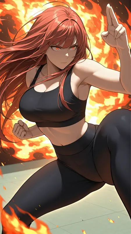 long hair, red hair, high ponytail, red eyes, cropped hoodie, pink hoodie, long sleeves, hood down, navel, black pants, high waist pants, yoga pants,