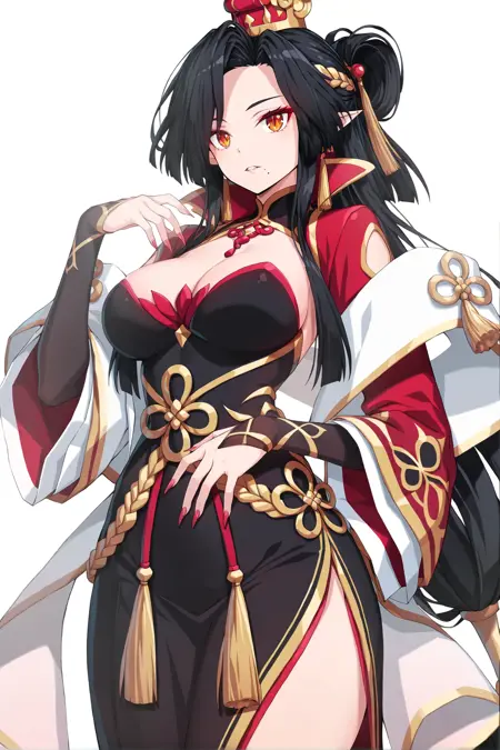 pointy ears, orange eyes, slit pupils, single mole under mouth, black hair, low-tied very long hair, traditional mini hat, large breasts, cleavage, black long dress, wide red sleeves, pointy nails, white shawl, thigh, red shoes