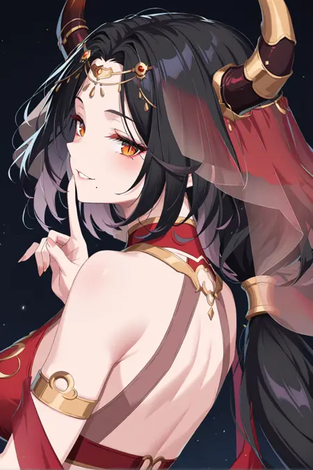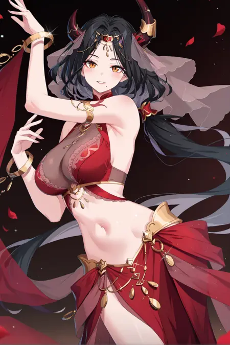 orange eyes, slit pupils, mole under mouth, horns, very long hair, black hair, low-ponytail, circlet, veil, large breasts, red halter bra, see-through black cleavage dress, navel, golden bangles, red shawl, red dancer long skirt, thighs, single thigh golden strap, golden sandals