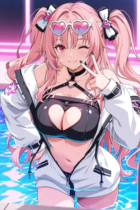 magenta eyes, pink hair, long hair, twintails, hair ornament, big breasts, black nail polish, black bikini heart cutout, sandals