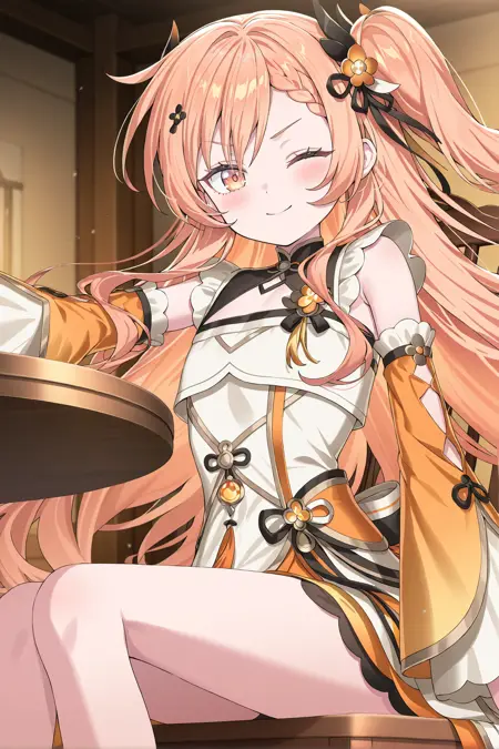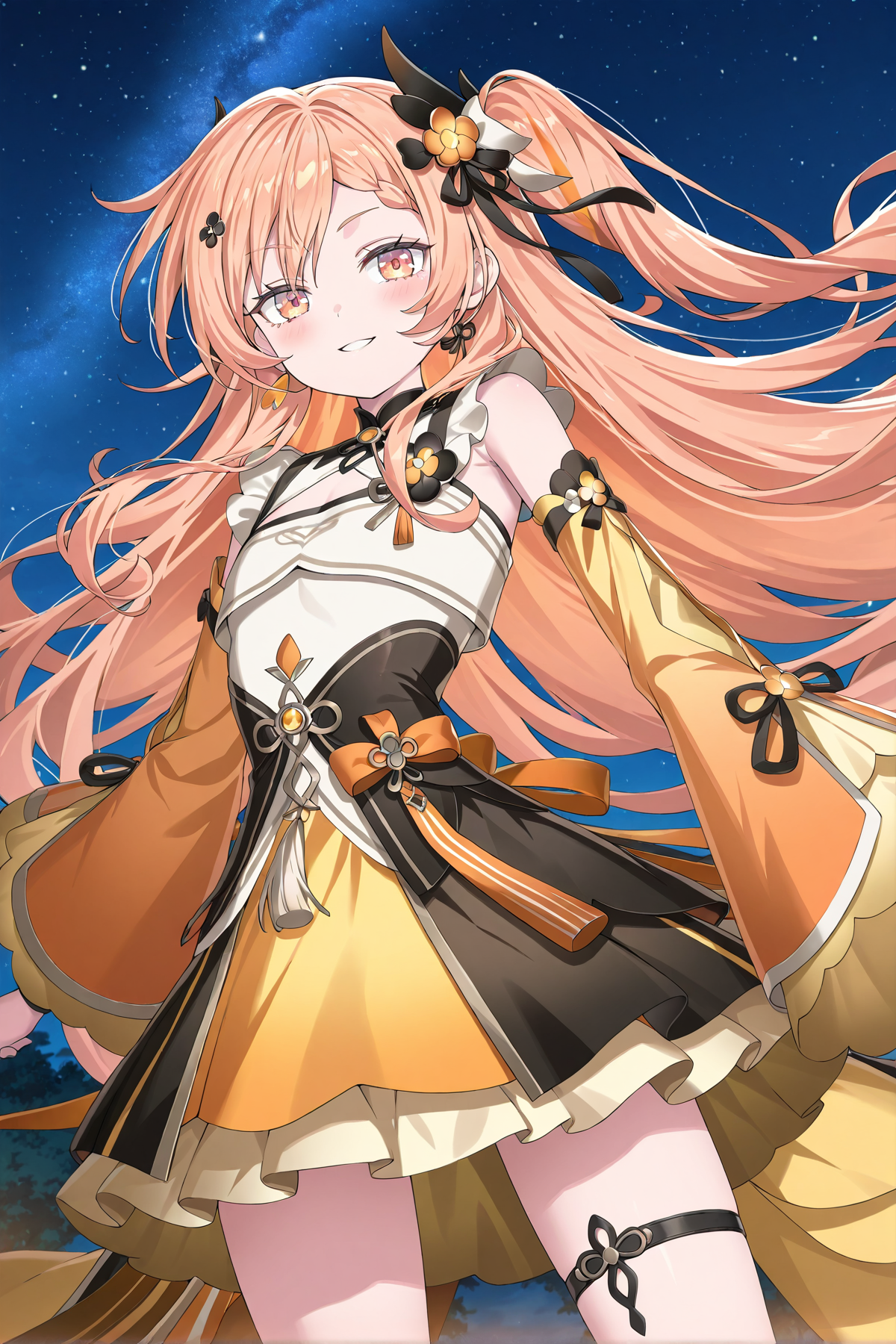 peach orange eyes, peach orange hair, long hair, braided bangs, side ponytail, hair ornament, flat chest, white dress, detached yellow sleeves, multilayered skirt, yellow skirt, black outer skirt, single thigh strap, shoes