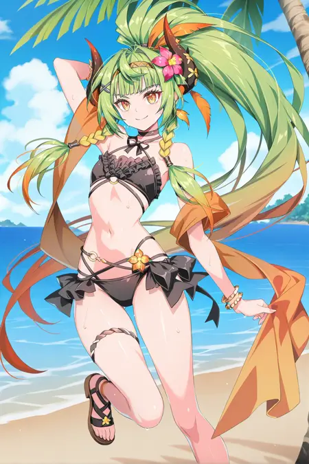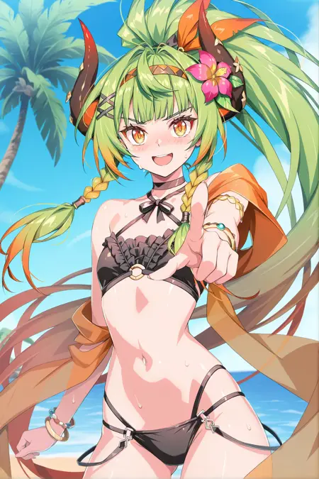 amber eyes, green hair, orange hair, gradient hair, bangs, horns, braided sidelocks, long hair, ponytail, hair ornament, choker, flat chest, black bikini, bracelet, sandals