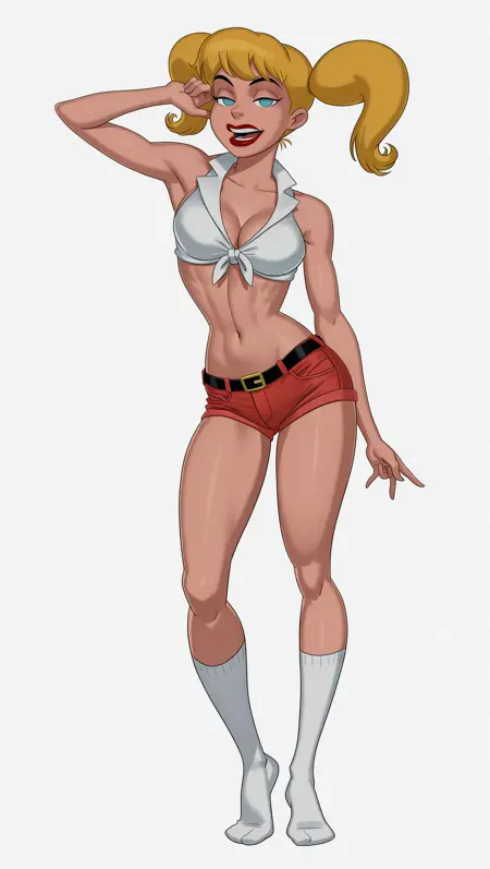 western comics (style), masterpiece, best quality, amazing quality, harley, 1girl, long hair, blonde hair, twintails, blue eyes, no pupils, medium breasts, crop top, white crop top, tied shirt, sleeves, short shorts, shorts, red shorts, belt, black belt, redlipstick socks, white socks, rollerblades, solo, pose, standing, looking at viewer, white background, simple background