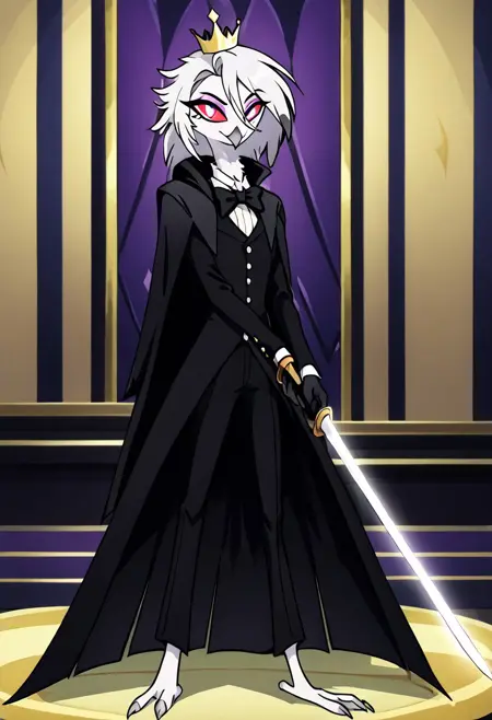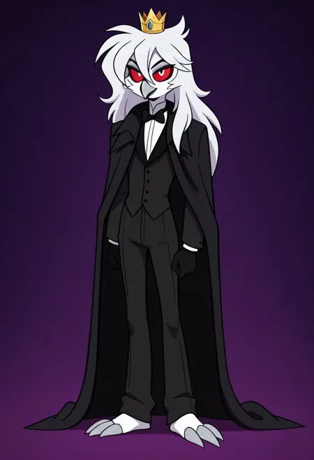 fluffy fur, detailed eyes, darkred sclera, white iris, pupilless eyes, symmetrical eyes, open eyes. (((furry, furry male, owl boy, owl demon, ((light silver beak)), silver foot claws white pupils, ((shoulder-length hair, silver hair, hair between eyes)), black fur, black hands, little golden crown))), (((black tuxedo), black bow tie, long sleeves, black royal cloak, ((black long pants))))