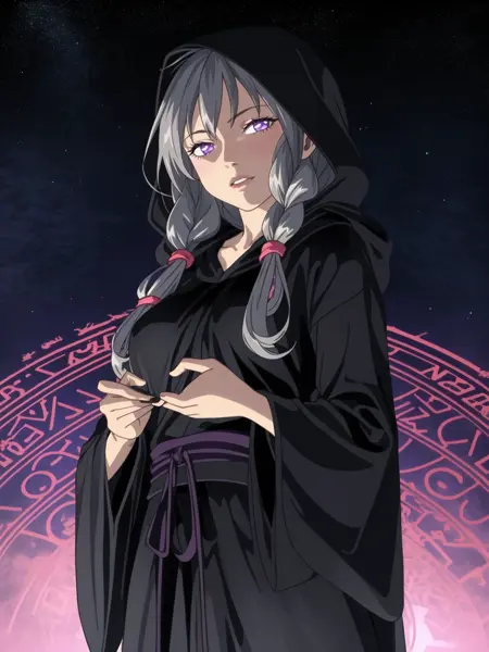 长发,编发侧辫,发圈,灰发,紫眼,嘴唇