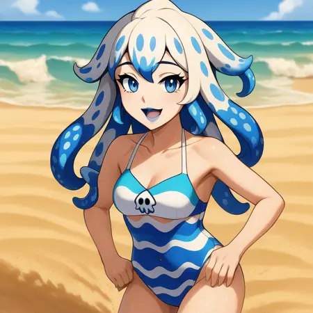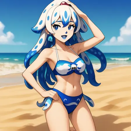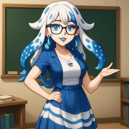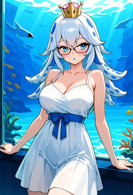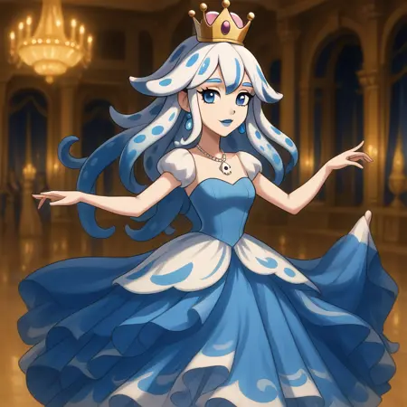 Bloopette, super crown, blue eyes, blue and white hair, tentacle hair, spotted hair, blue lipstick, blooper iconography,