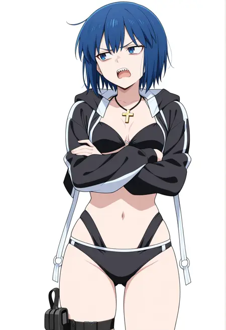 Swimsuit (no dress): short hair, blue hair, blue eyes, cross necklace, black bikini, cropped jacket, thigh holster