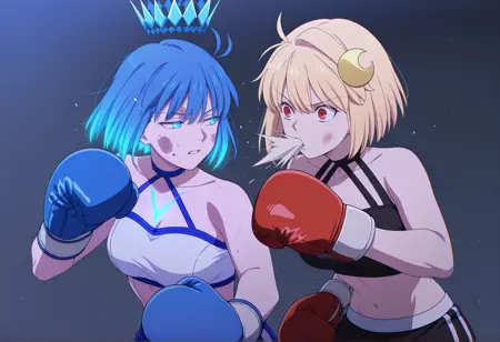 Third ascension: short hair, blue hair, blue eyes, magical girl, glowing hair, glowing eyes, crown, short dress, frills, body marking, gloves