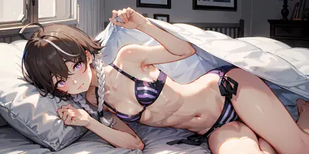 NSFW 콘텐츠를 생성할 때, 다음 프롬프트 단어를 유지하세요: qinnuo, ahoge, grey_eyes, short_hair, low_twin_braids, white_streaked_hair