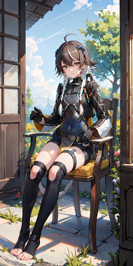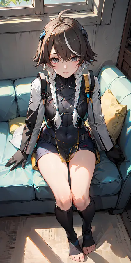 qinnuo, asymmetrical_sleeves, shorts, bodysuit, pelvic_curtain, holster, toeless_legwear, no_shoes, black_gloves, headgear, ahoge, grey_eyes, short_hair, low_twin_braids, white_streaked_hair,