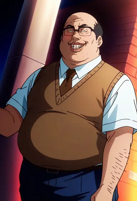 yasuno sensei,black eyes,bald, old, fat,lips,
