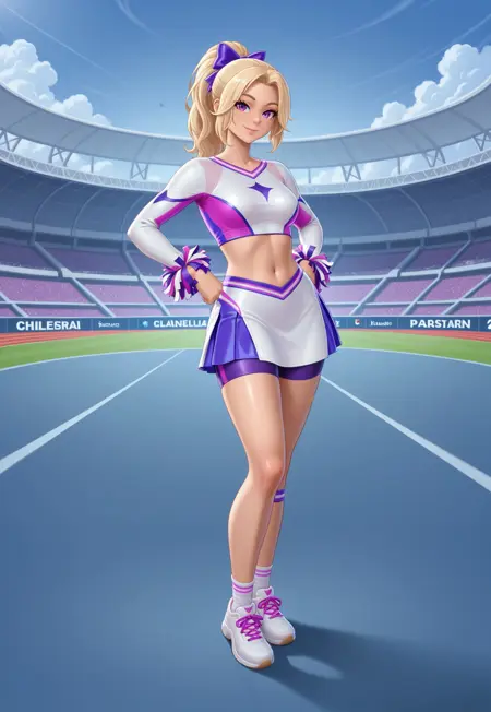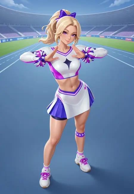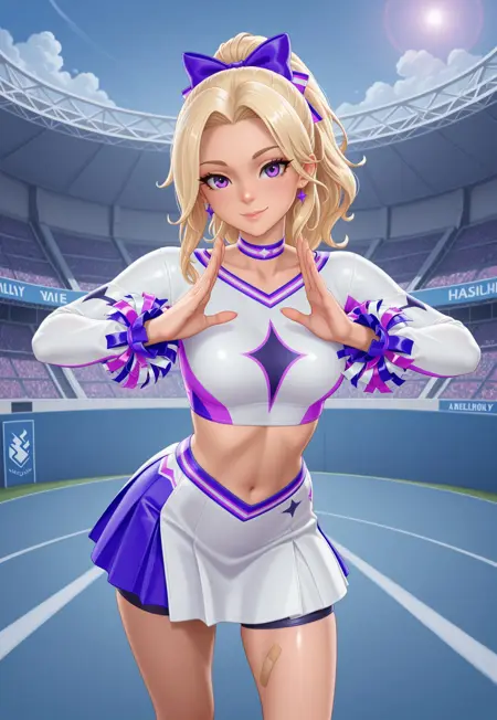 HayleeSkyeF, 拉拉队员,发带,发饰,金发,马尾,长发,薰衣草色眼睛,珠宝,露脐上衣,长袖,腹部,肚脐,白色蓝色紫色迷你裙,裙下穿骑行短裤,腿上贴创可贴,袜子,白色运动鞋,