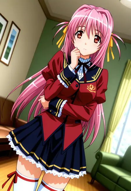 樱泽由奈(粉发): syuna,1girl,pink hair,long hair,ribbon,hair ribbon,two side up,red eyes,school uniform,skirt,zettai ryouiki,leg ribbon,thighhighs,thigh ribbon