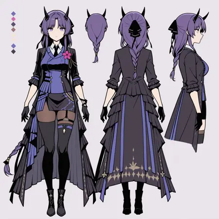 purple eyes, purple hair, hair ribbon, horns, braided ponytail, horn ornament