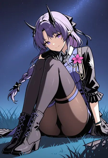 공식 복장, 흰 셔츠, 칼라 셔츠, 넥타이, 히비스커스, 검은 코트, 검은 부츠, 검은 장갑, 검은 허벅지양말, 갈색 팬티스타킹, 팬티스타킹 위의 허벅지양말, 검은 치마, 보라색 재킷