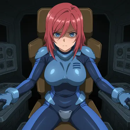 AnneroseGSSML, red hair, blue eyes, large breasts, blue bodysuit, pilot suit, skin tight, crotch plate,