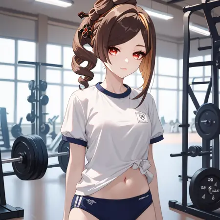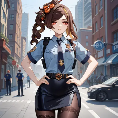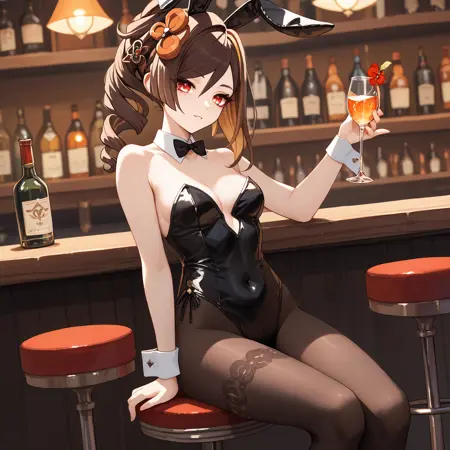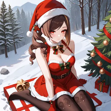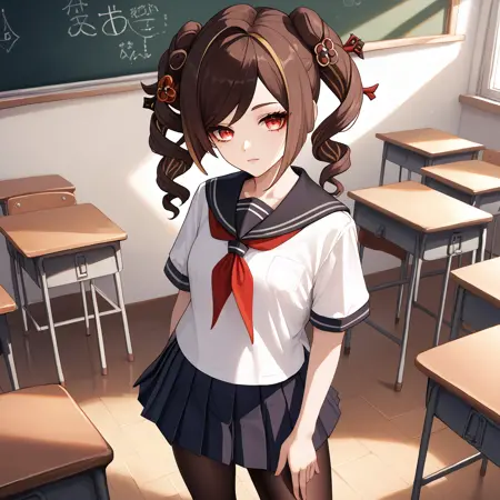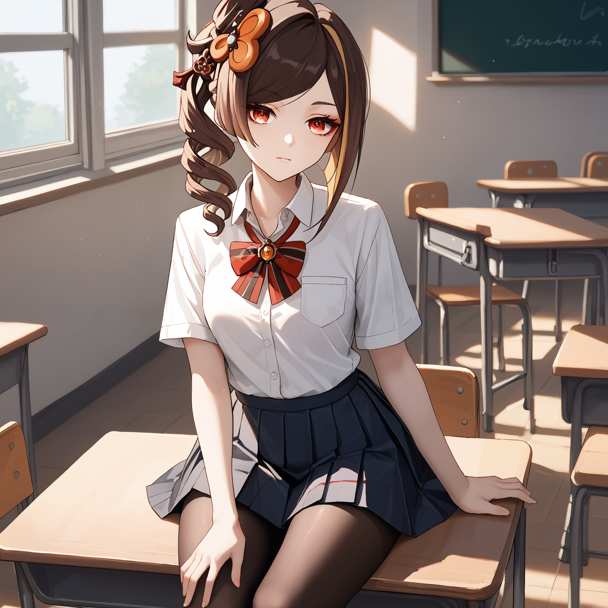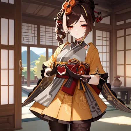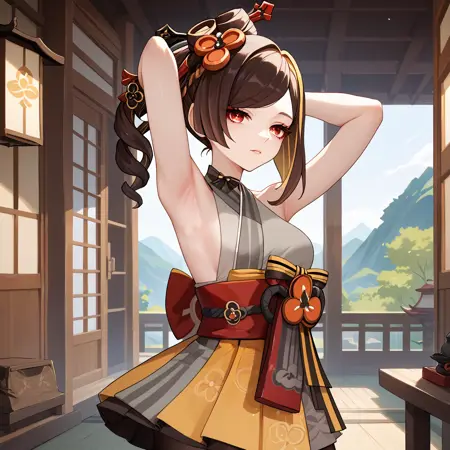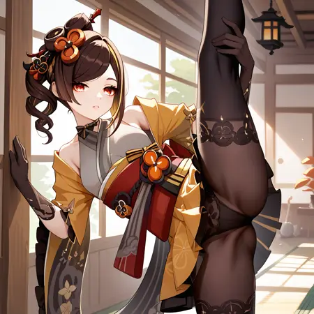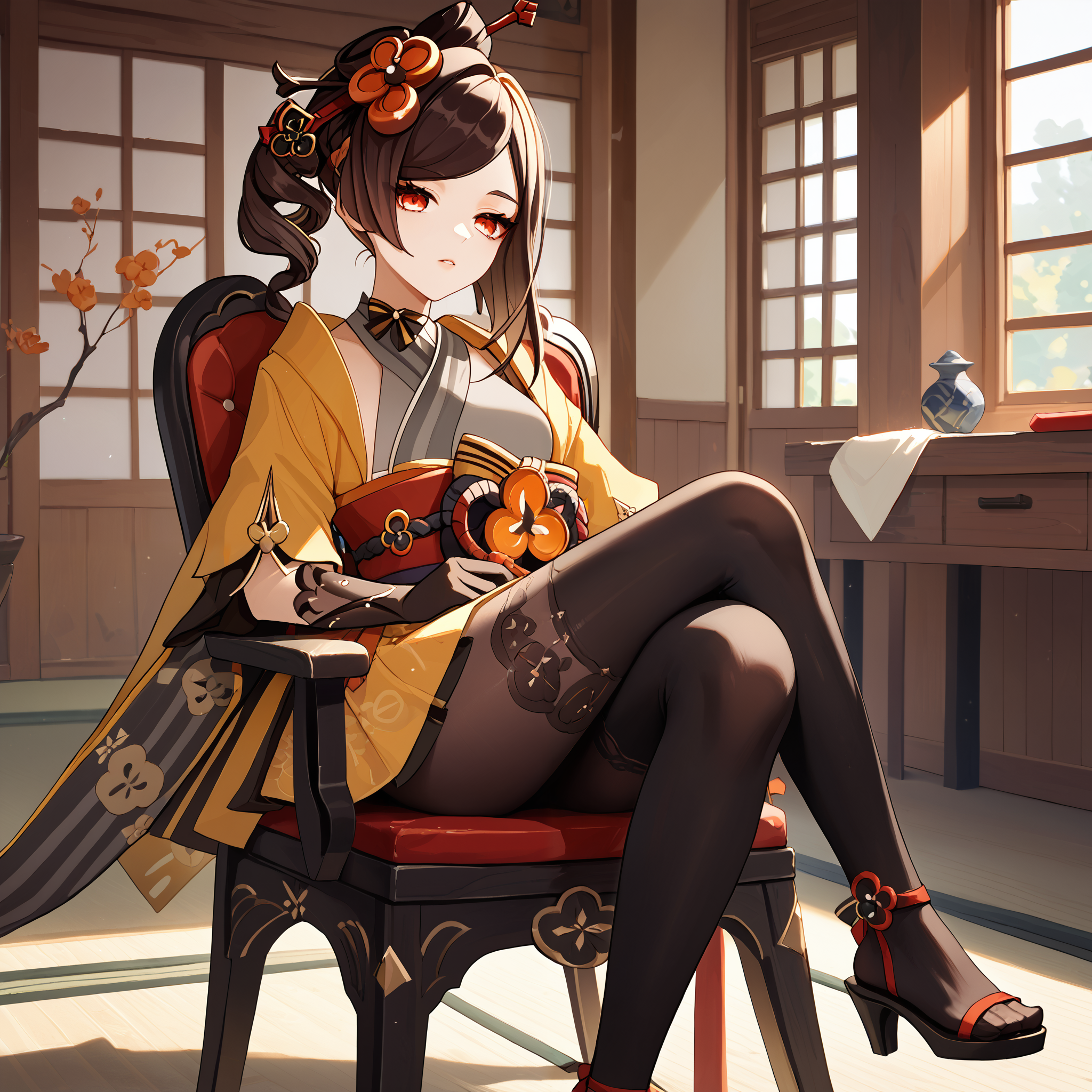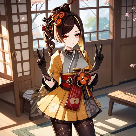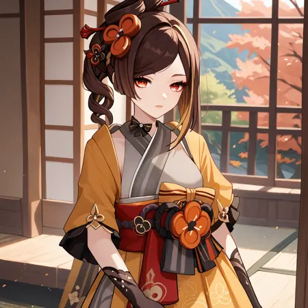 Default : chiori_(genshin_impact), brown hair, long hair, red eyes, multicolored hair, drill hair, hair ornament, hair stick, grey kimono, yellow kimono, obi, red sash, yellow skirt, black gloves, black pantyhose,