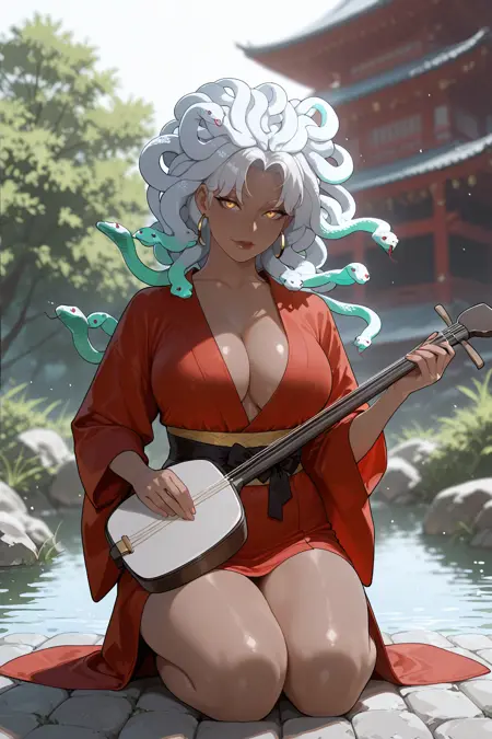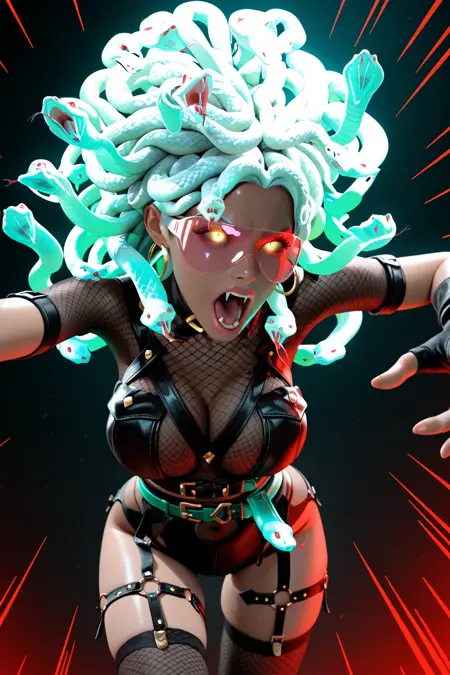 Trigger : Melanie, dark-skinned female, long hair, snake hair, white hair, multicolored hair, yellow eyes, pink tinted eyewear, visor sunglasses, Hoop earrings, detached collar, fishnet top, cleavage, halterneck, chest harness, between breasts, breast pocket, armlet, chest belt, belt, black gloves, fingerless gloves, black shorts, garter belt, covered navel, garter straps, o-ring, o-ring thigh strap, fishnet thighhighs, white socks, cross-laced footwear, high heels, snake