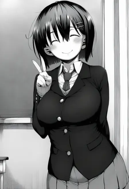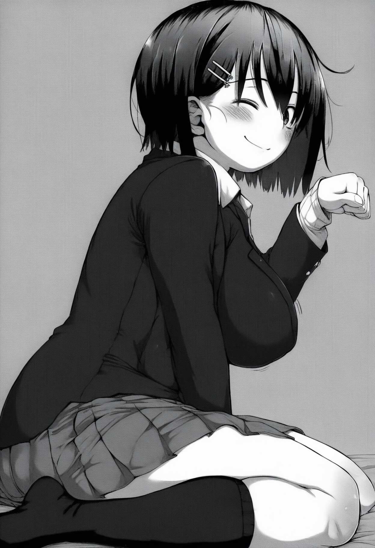 Triggerwords: greyscale, monochrome, c-maru, short hair, hairclip, large breasts,