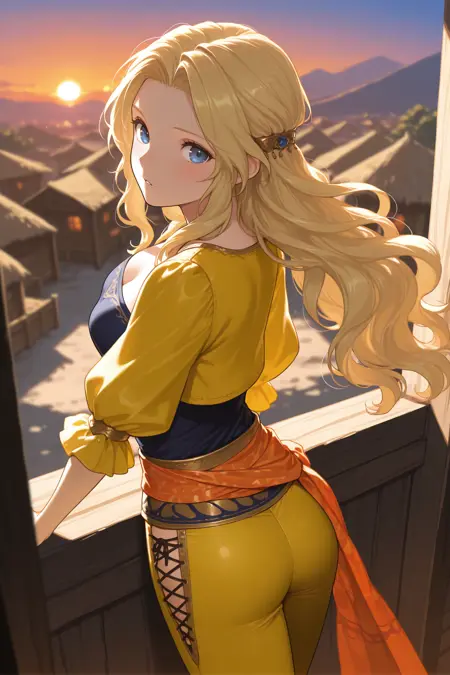 컨셉 아트 외모를 위해 "ffcls, 금발, 긴 머리, 중간 갈라진 앞머리, 파란 눈, 파마 모양 머리, 노란 조끼, 분리된 소매, 노란 소매, 진한 파란 셔츠, 가슴 노출, 띠, 노란 바지, 측면 끈 바지, 사롱, 흰 부츠"를 추가하세요.
