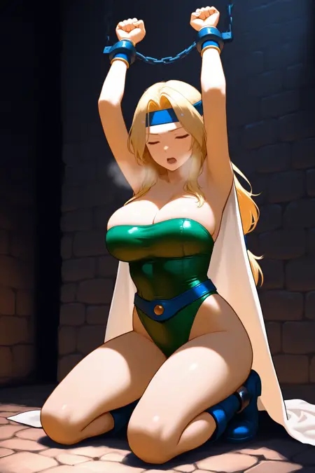 게임 내 외모를 위해 "ffcls, 금발, 긴 머리, 중간 갈라진 앞머리, 파란 눈, 파란 머리띠, 어깨 갑옷, 흰색 망토, 어깨 노출, 녹색 레오타드, 가슴 노출, 파란 벨트, 파란 팔찌, 파란 부츠"를 추가하세요.