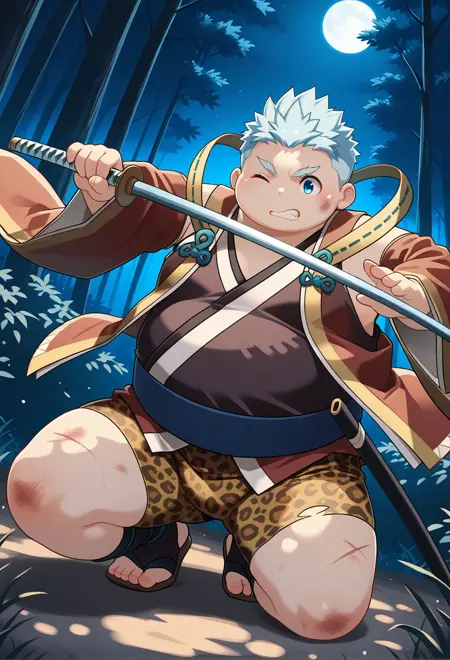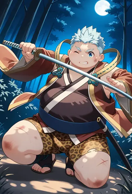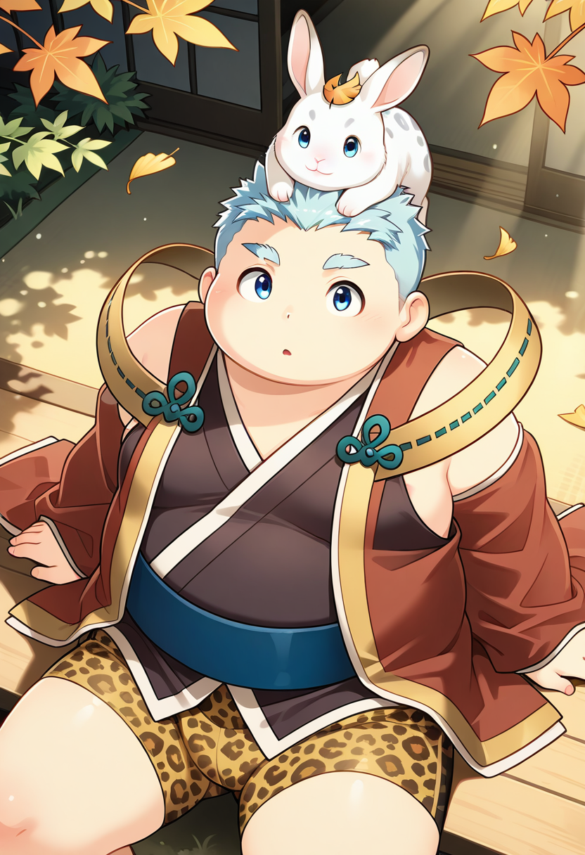 light blue hair, male focus, solojapanese clothes, red_haori, long_cutout_haori_jacket, hagoromo, detached sleeves, wide_sleeves, brown_sleeveless_kimono, blue obi, bike_shorts, leopard print, print shorts, black toeless footwear, sandals,