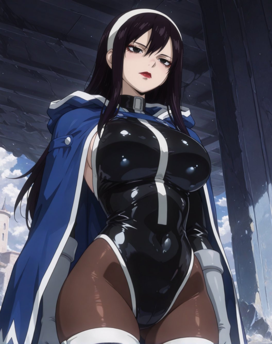 Ultear_Milkovich, 긴 머리, 검은 머리, 앞머리, 눈 사이의 머리카락, 검은 눈, 거대한 가슴, 곡선진 엉덩이, 반짝이는 피부, 메이크업, 빨간 립스틱, 허벅지까지 오는 양말, 팬티스타킹, 파란 망토, 흰색 헤어밴드, 흰 장갑, 하이힐, 검은 리오터드, 검은 허벅지까지 오는 양말, 팔꿈치 장갑, 검은 신발, 허벅지 부츠,