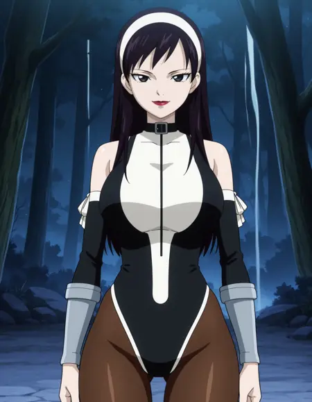 Ultear_Milkovich, 앞머리, 긴 머리, 검은 머리, 검은 눈, 거대한 가슴, 곡선진 엉덩이, 반짝이는 피부, 메이크업, 립스틱, 팬티스타킹, 헤어밴드, 검은 머리끈, 드러난 어깨, 분리된 소매, 팔꿈치 장갑, 흰 리오터드,
