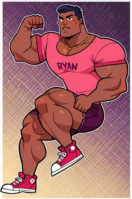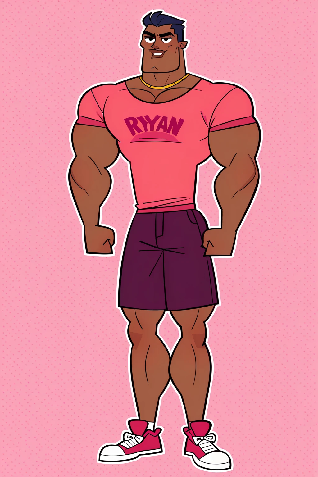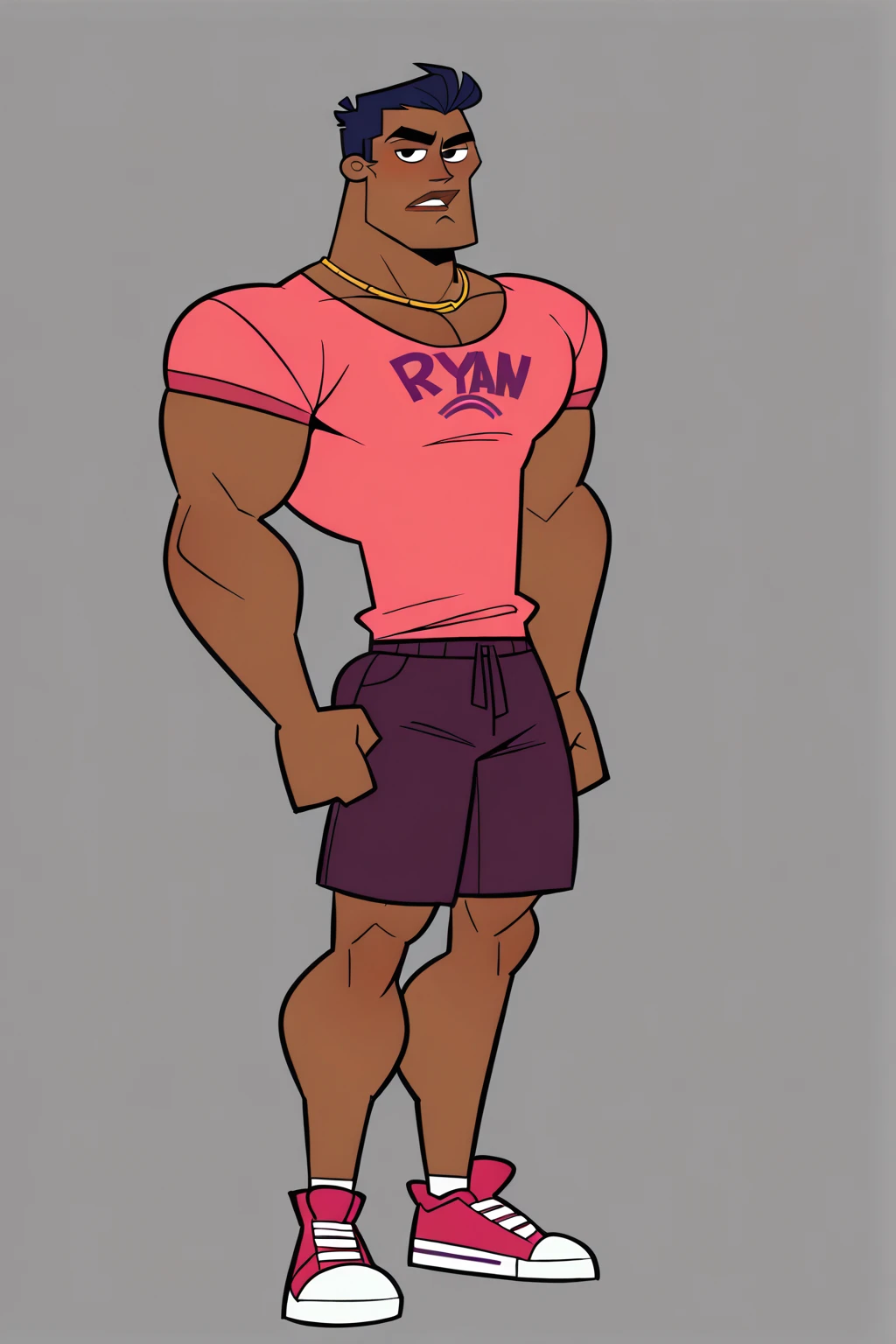 RyanTDRR, 1boy, dark skinned male, muscular build, pink t-shirt, dark purple shorts, red sneakers, short dark blue hair, lips, big lips, black eyes, yellow necklace, ryan (tdi),