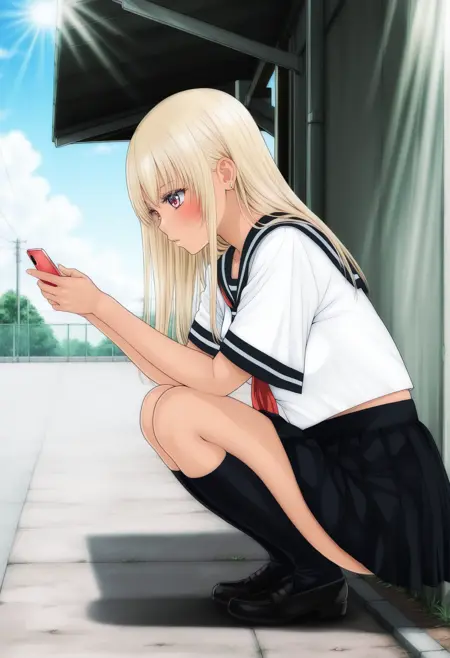 服装: 长发,水手领,水手服,短袖,红色领巾,百褶裙,