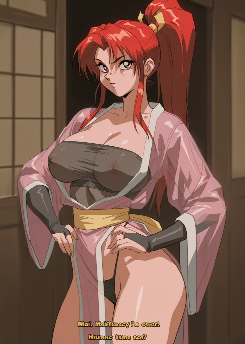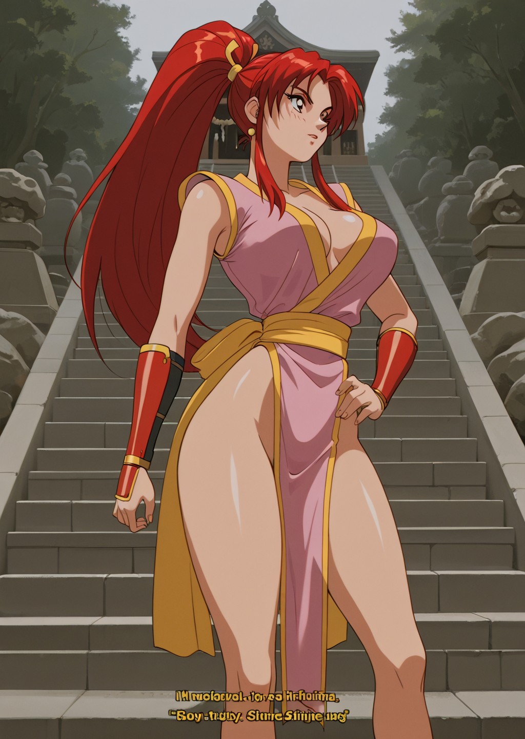 Mai /(maifftmp,red hair,long hair,MaiMain,ponytail,pelvic curtain,breast,pink clothes,yellow trim,red arm guards,yellow sash/)