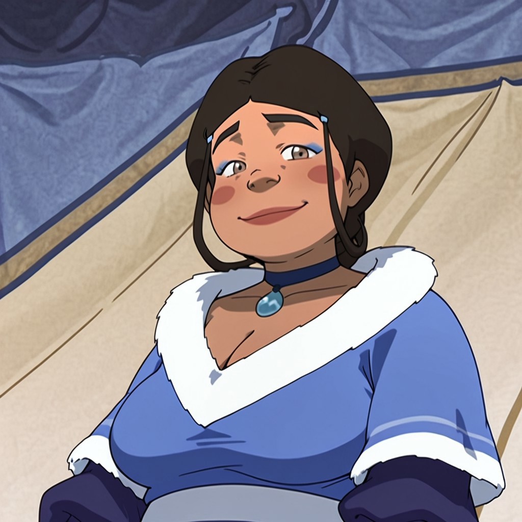 eikatara, dark skinned female, mature female, eye wrinkles, chubby female, brown eyes, brown hair, braided ponytail, brown eyes, red oval makeup on cheeks, blue eyeshadow, blue high slit dress, white fur trim, blue boots, blue choker with pendant, large breasts, cleavage