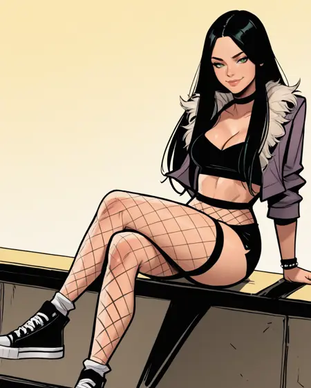 休闲:laurawolverine, 1girl, 黑发, 长发, 绿眼, 短上衣, 黑色短裤, 鱼网袜, 乳沟, 夹克, 毛皮, 项圈, 手镯, 运动鞋