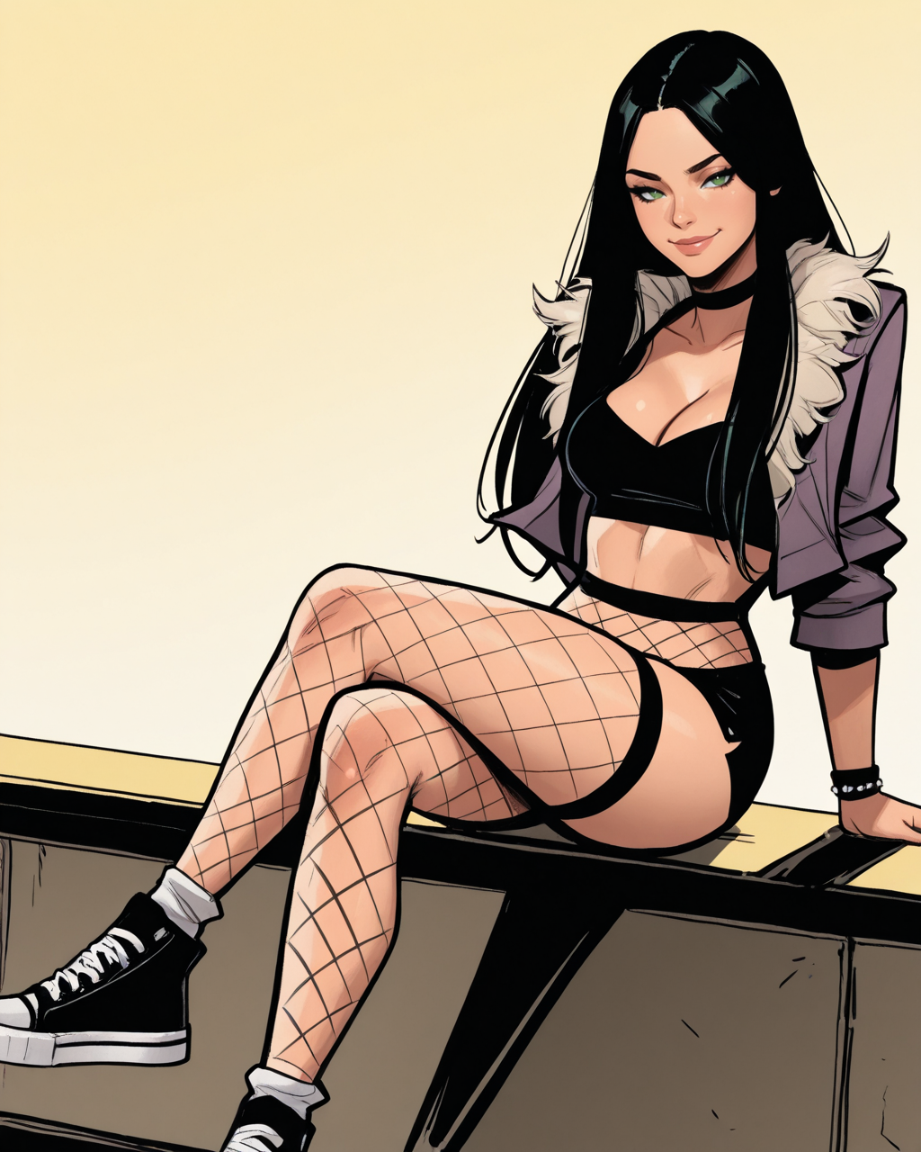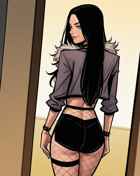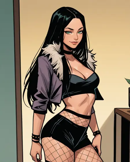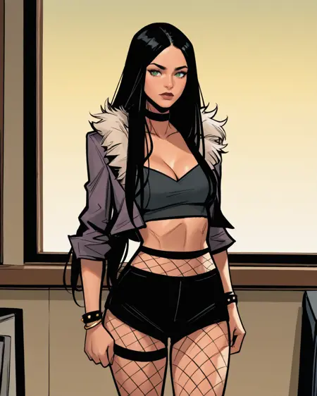 Casual: laurawolverine, 1girl, black hair, long hair, green eyes, crop top, black shorts, fishnets, cleavage, jacket, fur, choker, bracelet, sneakers
