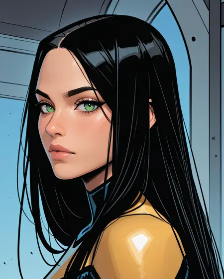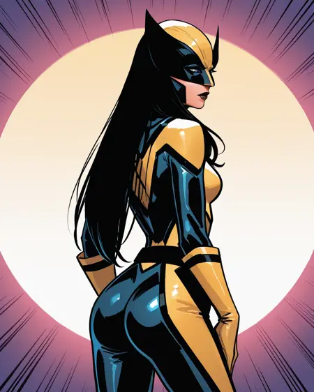 Wolverine: laurawolverine, 1girl, black hair, long hair, bodysuit, mask, belt