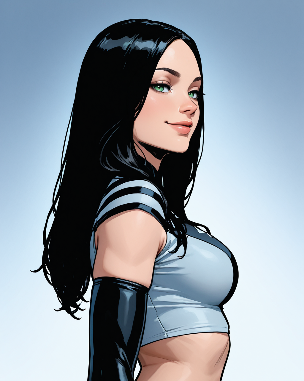 X-Force: x23xforce, 1girl, long hair, black hair, green eyes, crop top, belt, pants, midriff, elbow gloves, boots