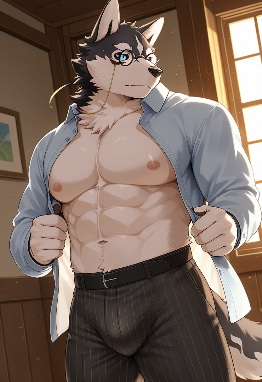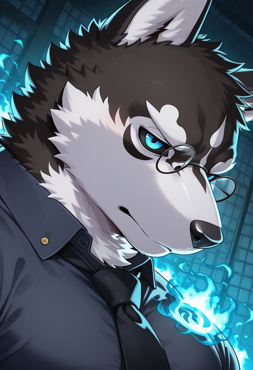 Reinforcement Prompts: "dog boy, grey fur, furry, tail, black sclera, blue eyes, tattoo, muscular, large pectorals"