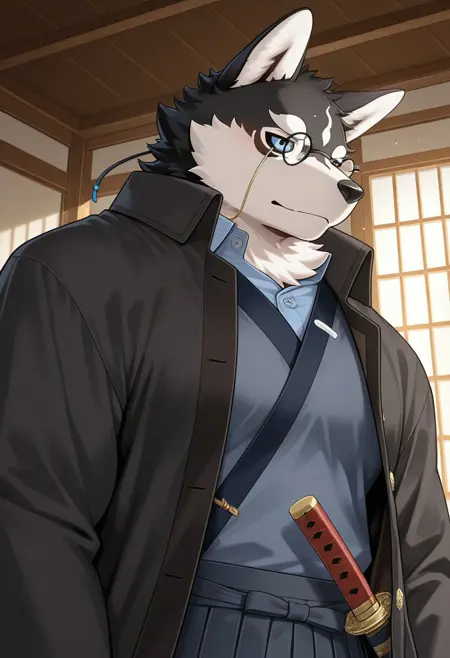 Outfit Prompts: "hakama, black collar shirt, black coat, Japanese clothes, argyle sweater, vertical-striped pants, belt, eyewear"