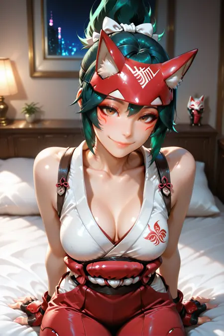 ilkiriko, 1girl, 유방, 젖꼭지, 남성 생식기, 성관계, 여우 마스크, 규제 없음, 1boy, 반마스크, 정액, 이성애, 여자 생식기, 녹색 머리, 큰 가슴, 일본 복장, 갈색 눈, 벌어진 입, 질, 기모노, 눈을 굴리는, 접힌, 질 안에 정액, 고환, 엉덩이, 아헤가오, 누워있는, 밤, 마스크, 등 위, 항문, 하트, 정액이 넘쳐흐르는, 단독 초점, 두꺼운 허벅지, 이빨<lora:illustrious Kiriko 768x1152:1>