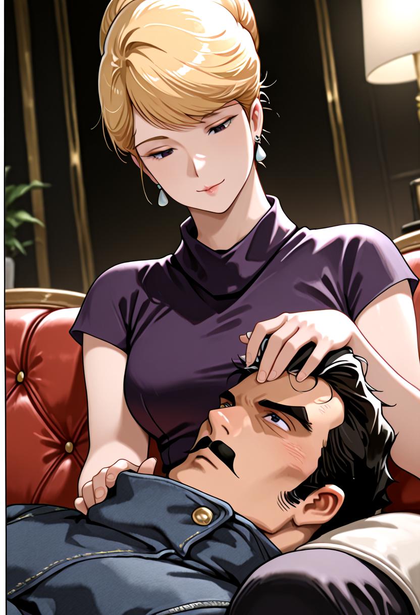 1boy, r4nb4r4ru,((adult male)), black hair, black eyes, facial hair, mustache, sideburns, thick eyebrows, long sideburns,lora:Crowley\_Hamon\_-\_GUNDAM\_THE\_ORIGIN\_-\_100percent\_-\_Manga:1,lie down, dark blue purple Casual_wear,