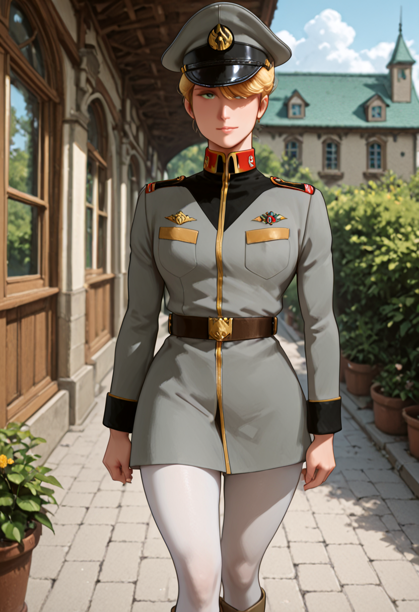 1girl, Cr0wley,h4m0n, Blonde hair, single hair bun, Mature Woman, r_military gray uniform, white tights,