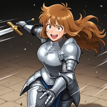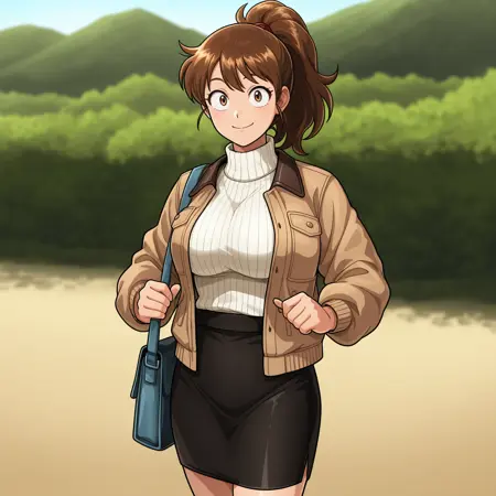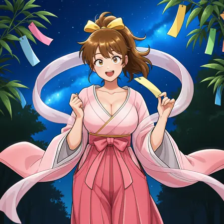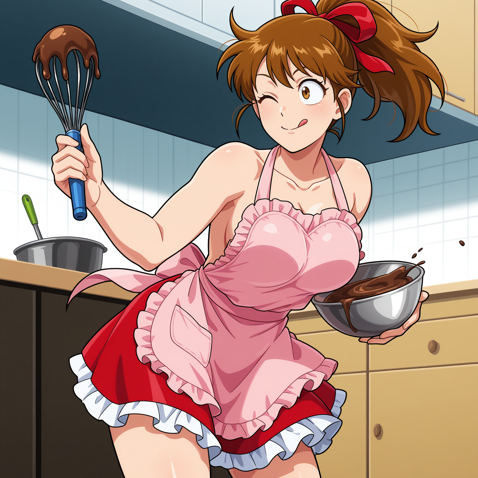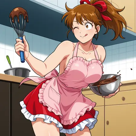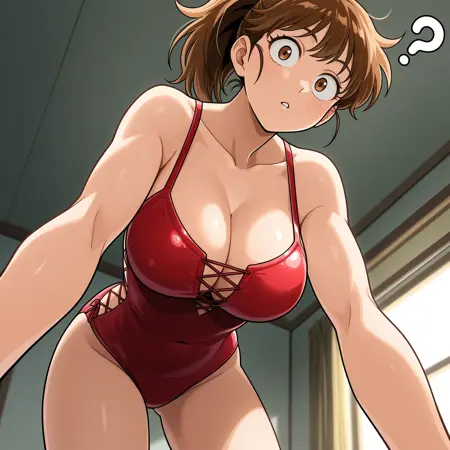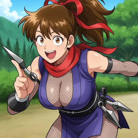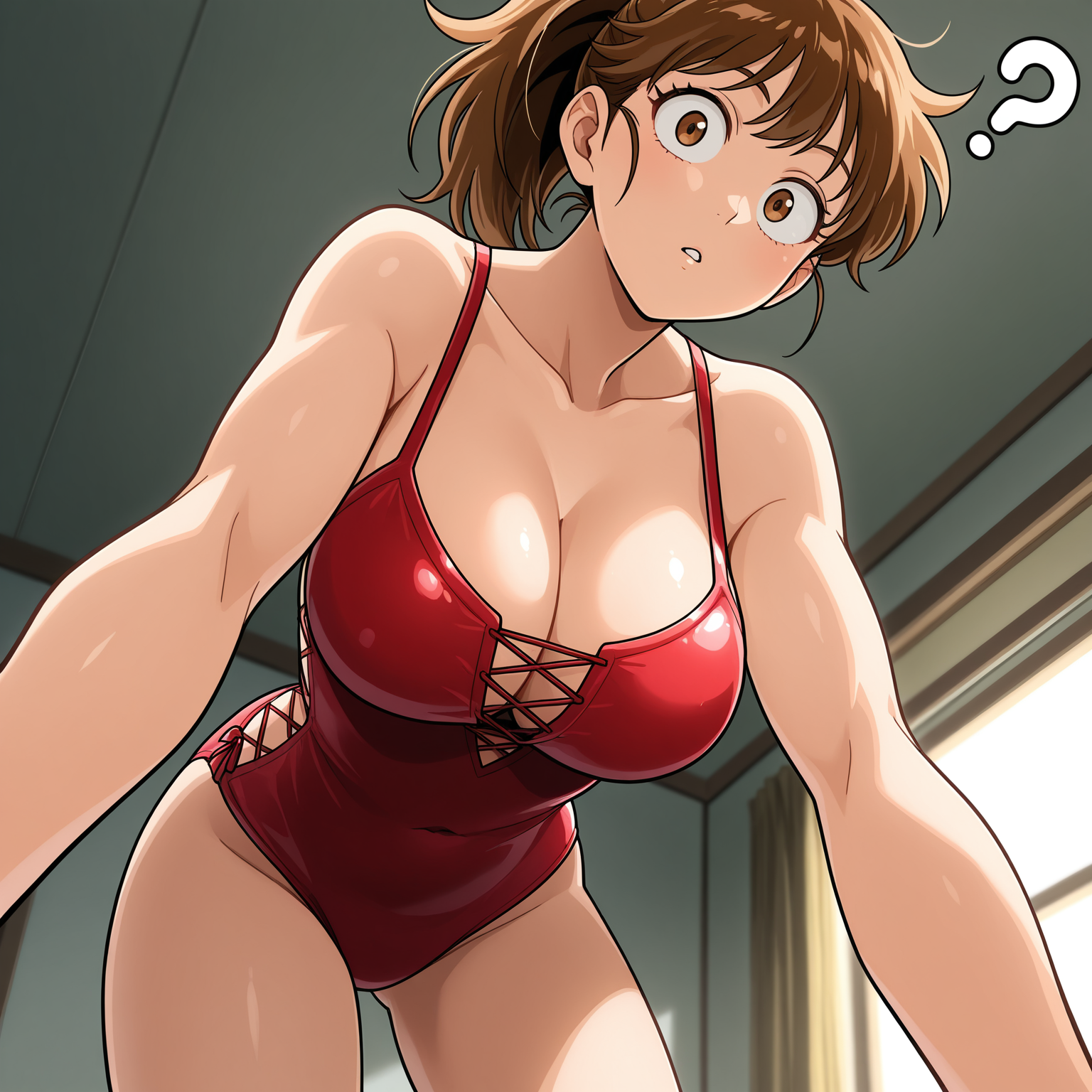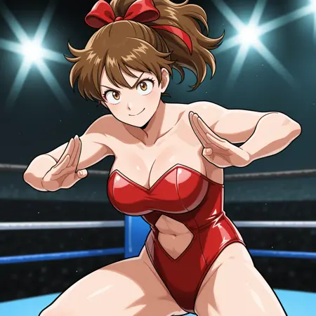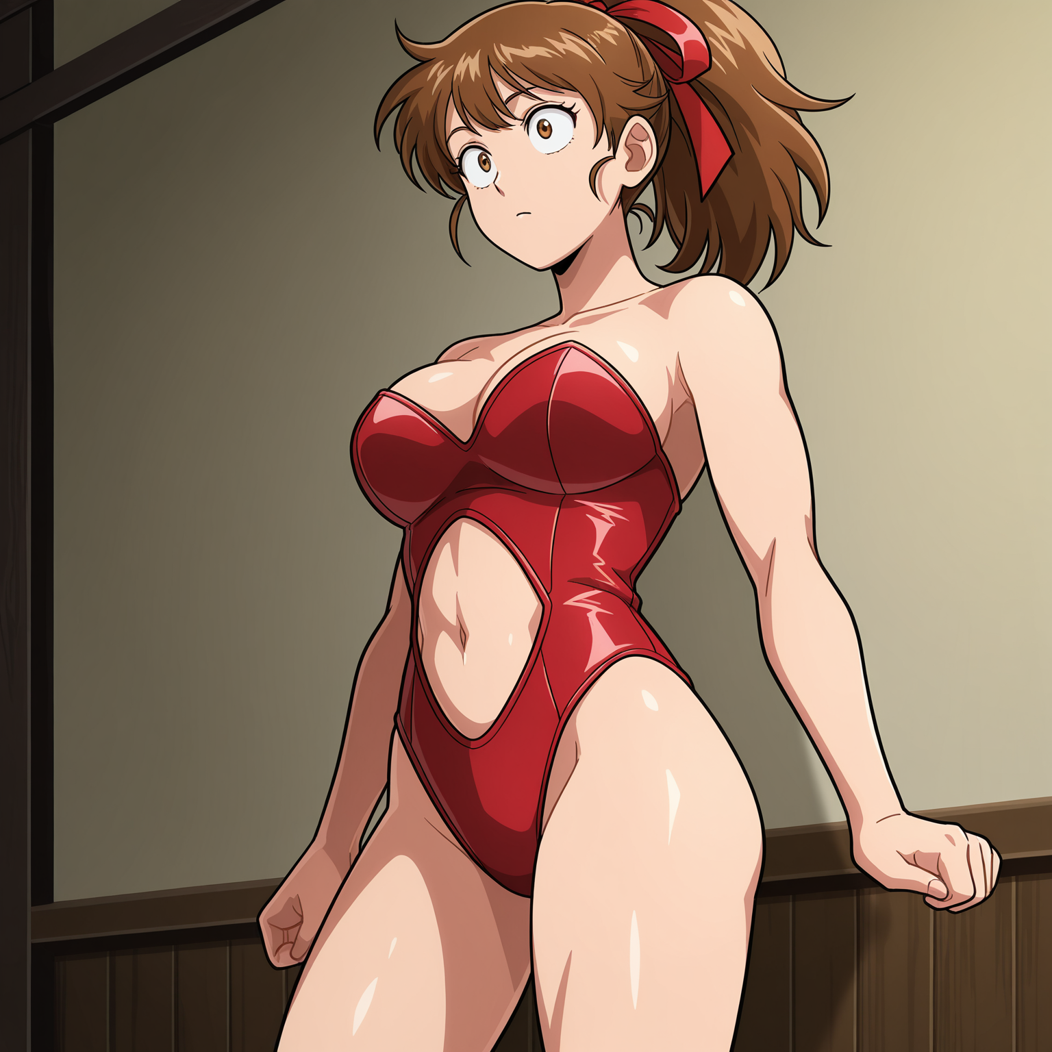 BibimbaKM, brown hair, ponytail, red ribbon, hair ribbon, brown eyes, sanpaku, large breasts, toned female,