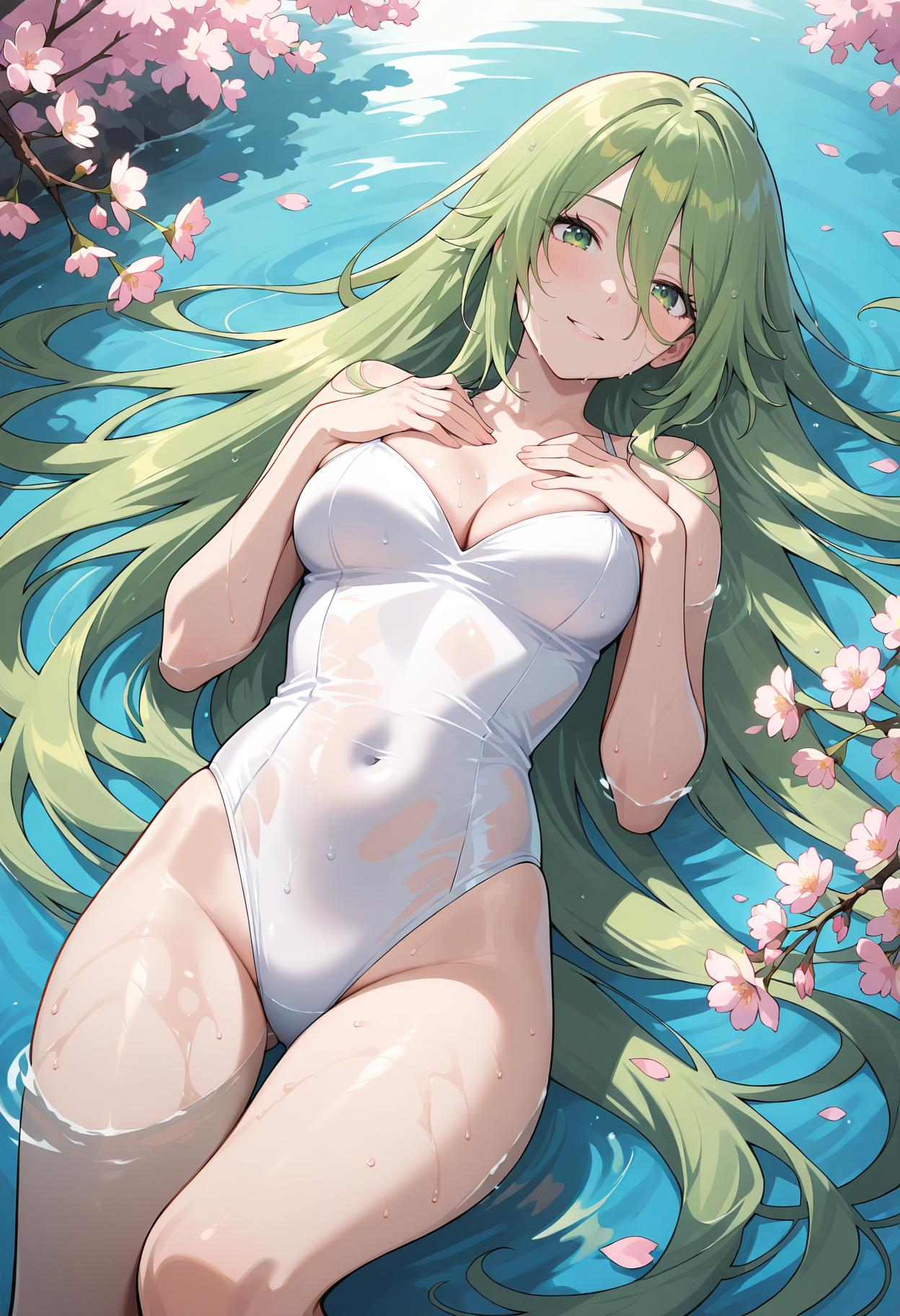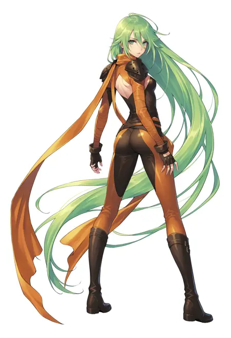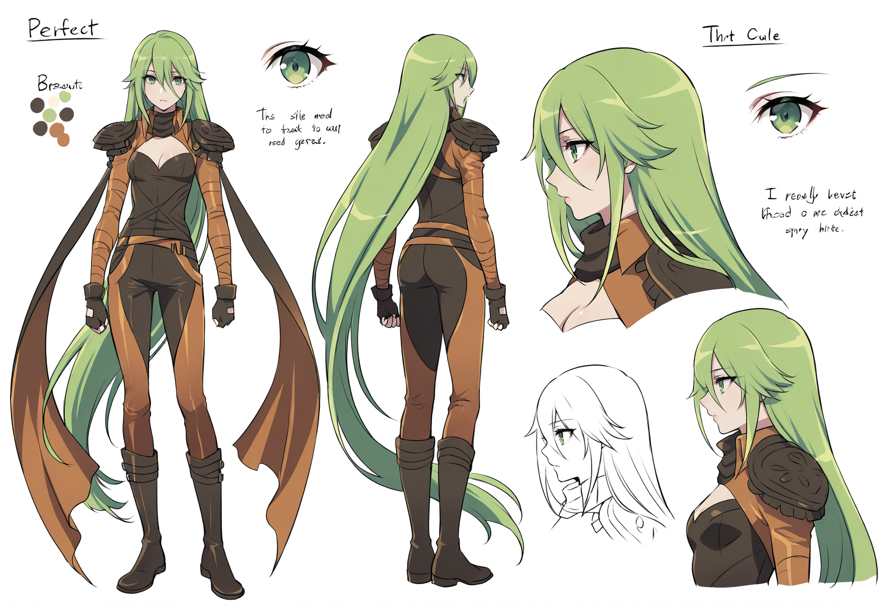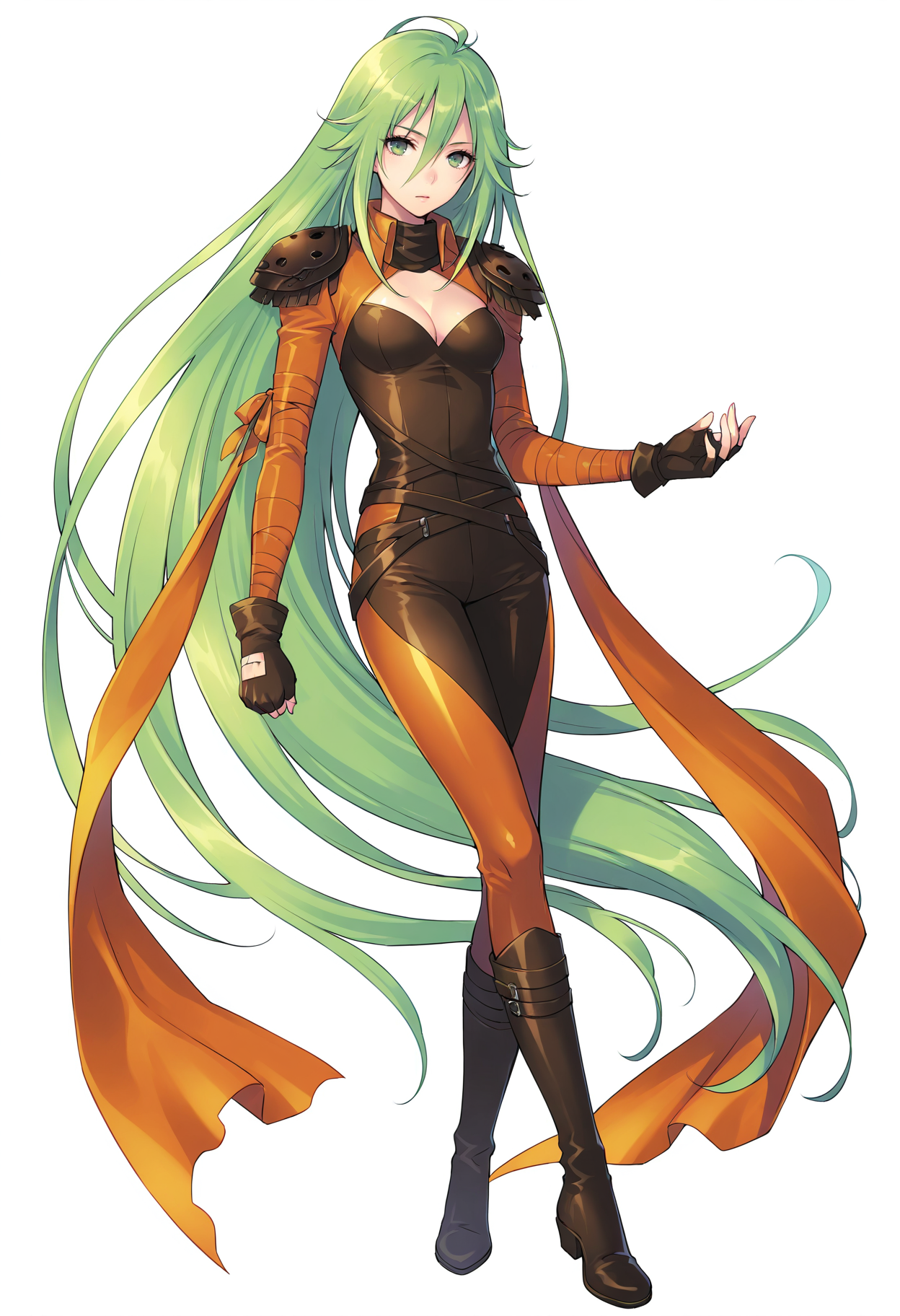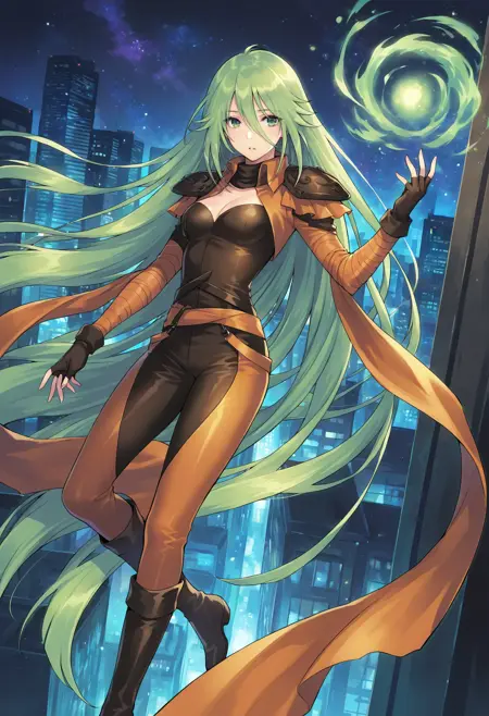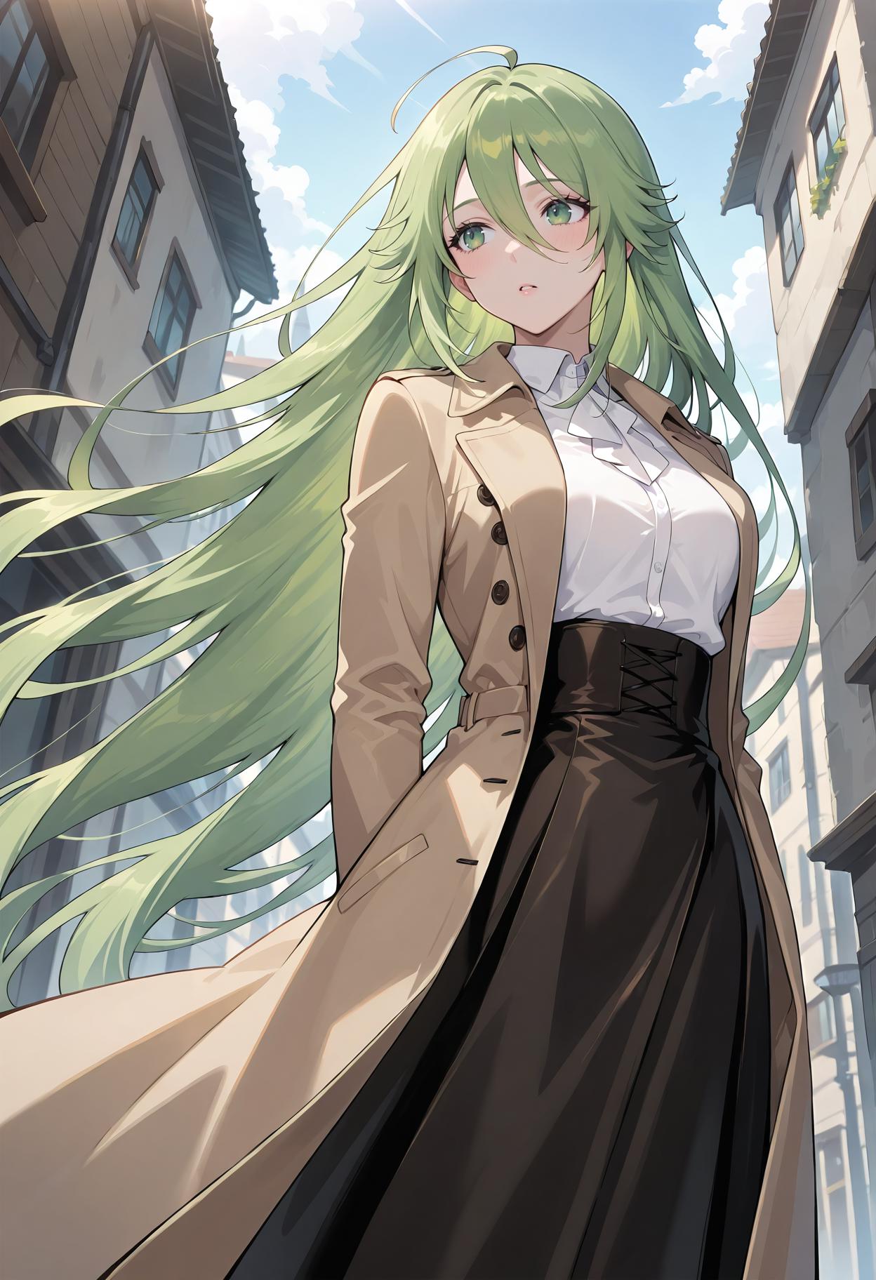 Appearance: 1girl, long hair, green hair, green eyes,hair between eyes, very long hair