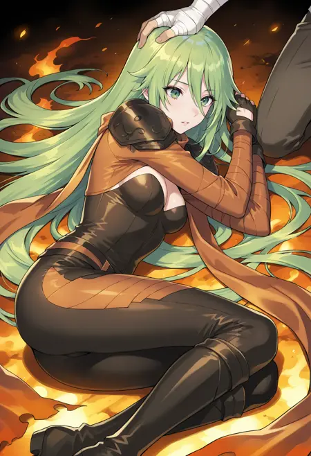 Draft outfit: boots, gloves, breasts, scarf, black gloves, knee boots, cleavage cutout, black footwear, pants, clothing cutout, capelet, cape, bodysuit, small breasts, gloves, fingerless gloves, medium breasts, shoulder pads, bandages, shoulder armor
