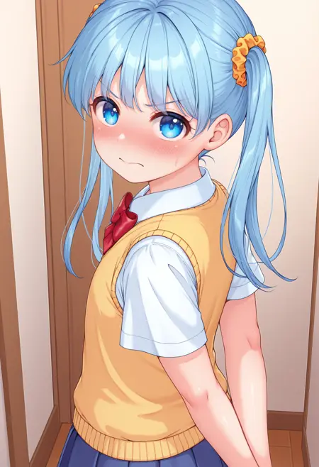 교복, 빨간 리본 넥타이, 짧은 소매, 흰 셔츠, 노란 조끼, 주름치마, 파란 치마,
