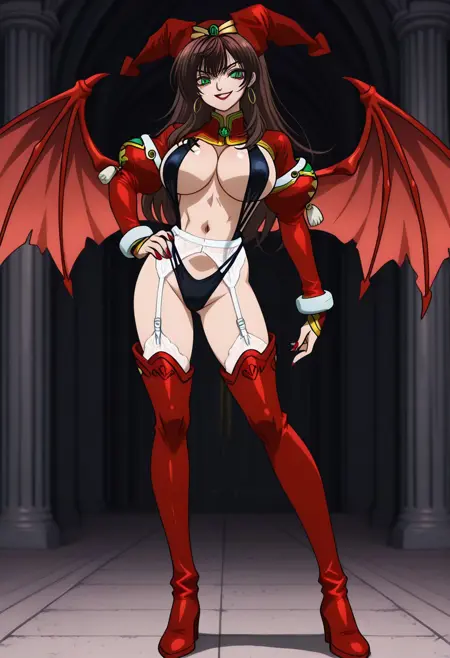 PDianno, 1girl, solo, wings, large breasts, curvy, wide hips, mature female, adult woman, mature face, hoop earrings, red footwear, jewelry, red thighhighs boots, red jester cap, white garter belt, white garters, green eyes, navel, high heels, long hair, brown hair, black slingshot swimsuit, red lips, black demon wings, revealing clothes, shrug \(clothing\), makeup, long sleeves, red nail polish, demon girl, detached sleeves, red sleeves, black panties, parted lips, puffy sleeves,